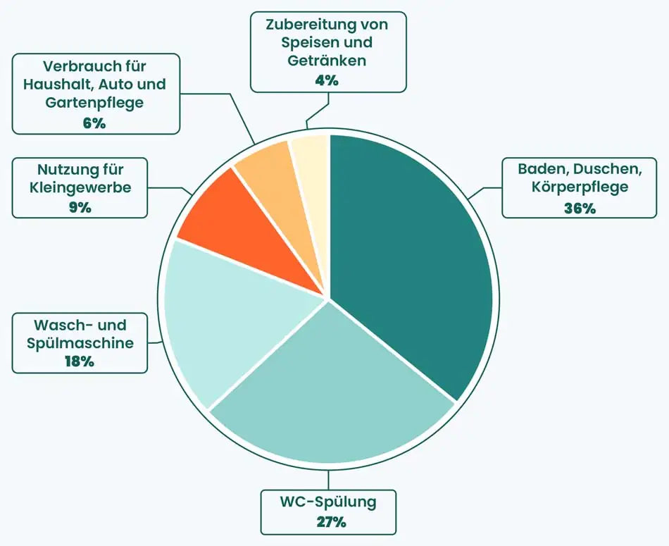 Laut Umweltbundesamt (2021) teilt sich unser täglicher Wasserbrauch von ca. 128 Liter pro Kopf wie folgt auf: