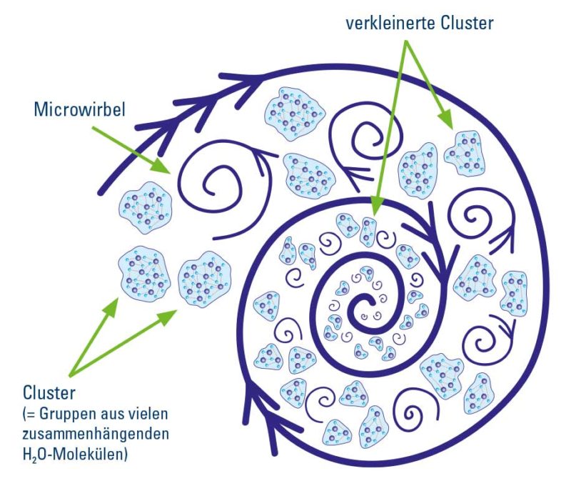 Illustration eines Wasserwirbels zeigt Verkleinerung von Wassermolekülclustern.