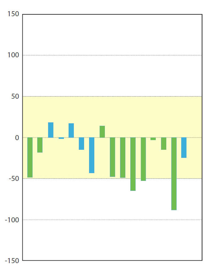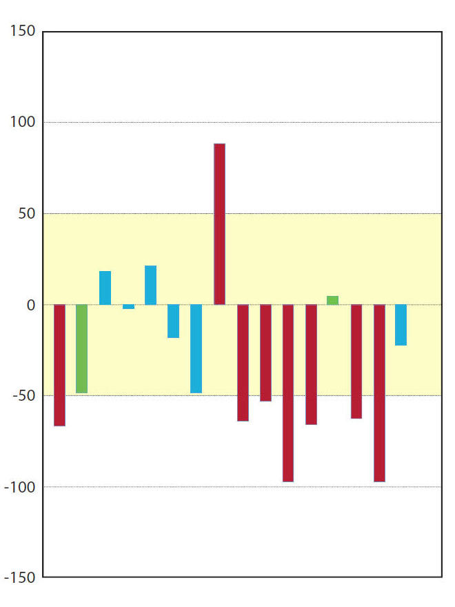 Die rechte Abbildung (2. Messung) zeigt dieselben Probanden nach einem dreimonatigen Konsum von UMH-Wasser. Alle Probanden weisen eine verbesserte Balance zwischen intra- und extrazellulärem Wasserstatus auf. Die meisten befinden sich sogar im Normalbereich (gelber Bereich: -50 bis 50). Durch die UMH-Wasseraufbereitung gelingt es somit, das Wasser zellgängiger zu machen und bestehende Dehydrierungen zu korrigieren.