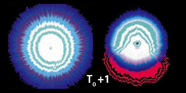 Das COLORPLATE®-Verfahren nach Dr. Knapp ermöglicht die Visualisierung der Polarisierung des Wassers. Die Bilder zeigen, dass Wasser, das mithilfe der UMH-Technologie aufbereitet wurde, einen starken bioelektrischen Feldaufbau aufweist, wobei der untere Bereich im roten und der obere Bereich im türkisen Bereich liegt. Wasser, das auf diese Weise behandelt wurde, gewinnt seine ursprüngliche Vitalität zurück und ist optimal dazu in der Lage, den Körper mit gelösten Mineralien zu versorgen.